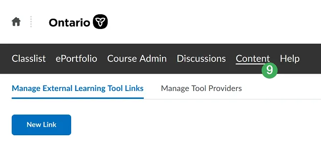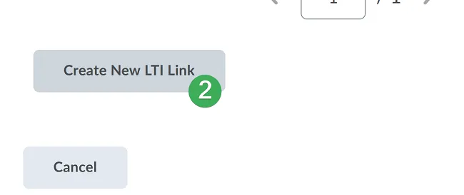 Paso 1. Ve a “Actividades Existentes” → “Herramientas de Aprendizaje Externas” (1), luego haz clic en “Crear Nuevo Enlace LTI” (2).