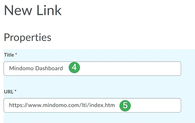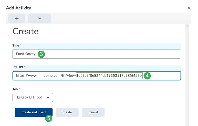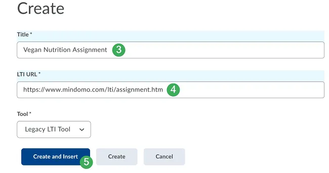 https://www.mindomo.com/lti/assignmenten la sección de URL (4). - Haz clic en “Crear e Insertar” (5).