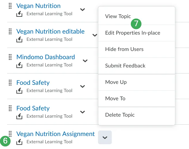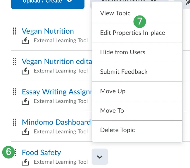 Paso 3. El enlace de la asignación aparecerá en la sección del curso (6). Puedes verlo y editarlo cuando sea necesario (7).