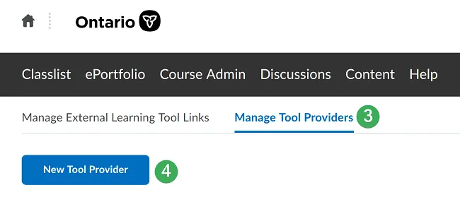 Paso 3. Ve a “Gestionar Proveedores de Herramientas” (3) y selecciona “Nuevo Proveedor de Herramientas” (4).