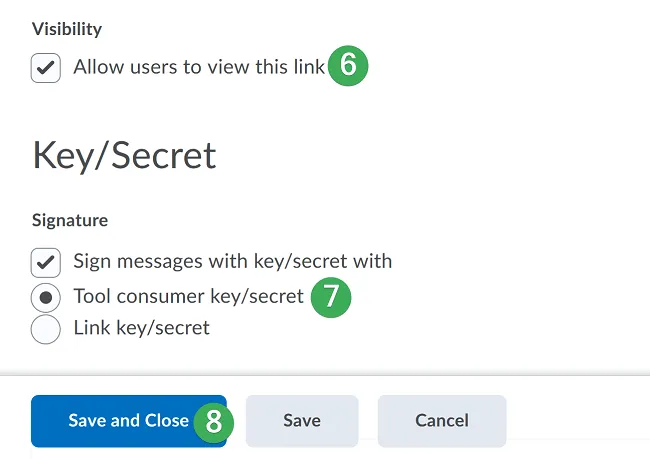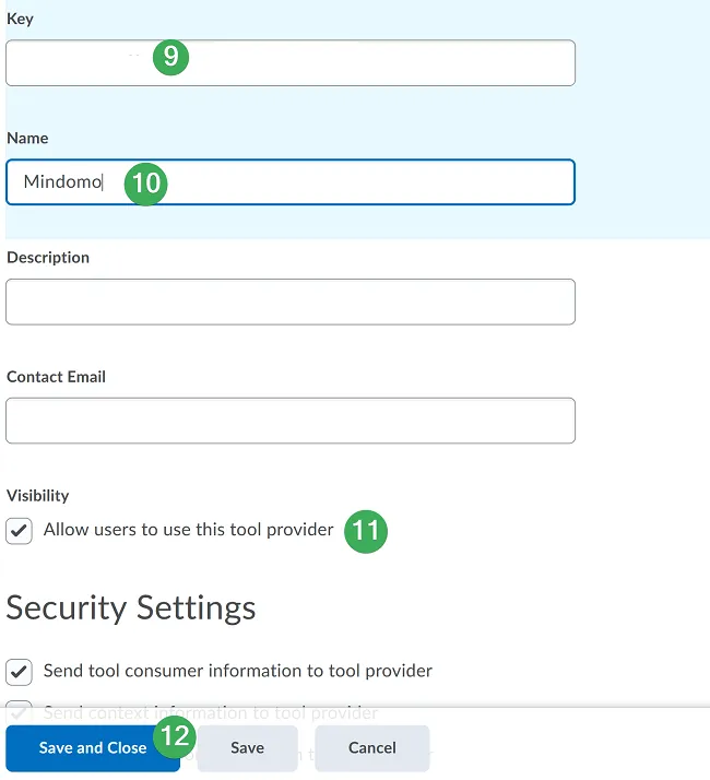 Paso 5. Añade tu Clave (9), escribe un nombre para la herramienta externa (10) y marca “Permitir a los usuarios utilizar este proveedor de herramientas” (11). Asegúrate de que todas las opciones bajo Configuraciones de Seguridad también estén seleccionadas. Haz clic en “Guardar y Cerrar” (12). Ahora deberías poder añadir Mindomo a tu curso.