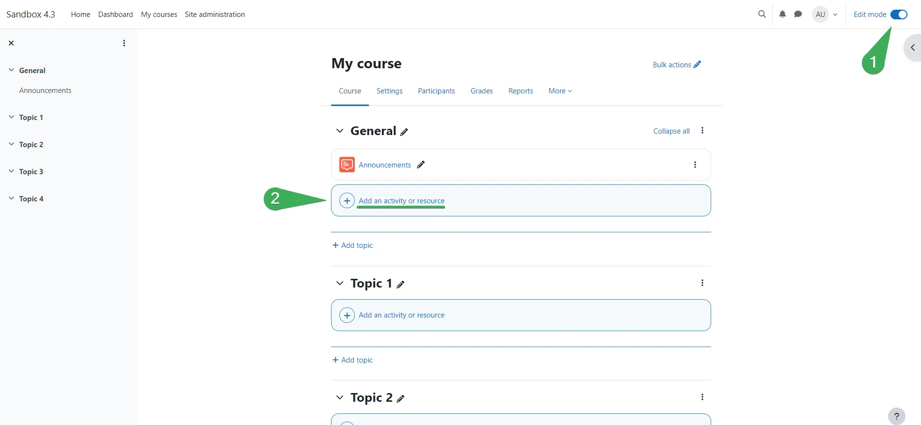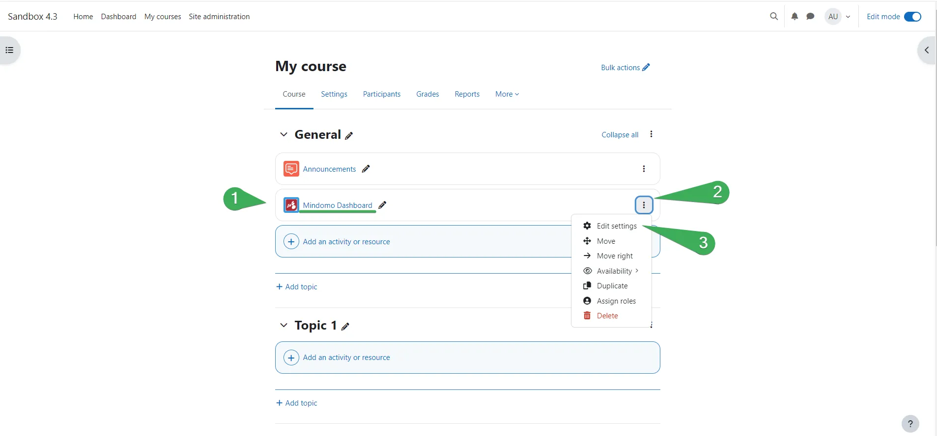 Paso 1. Antes de añadir el panel de Mindomo (o una tarea o diagrama) a una sección del curso de Moodle, asegúrate de que el modo de edición esté habilitado (1).
