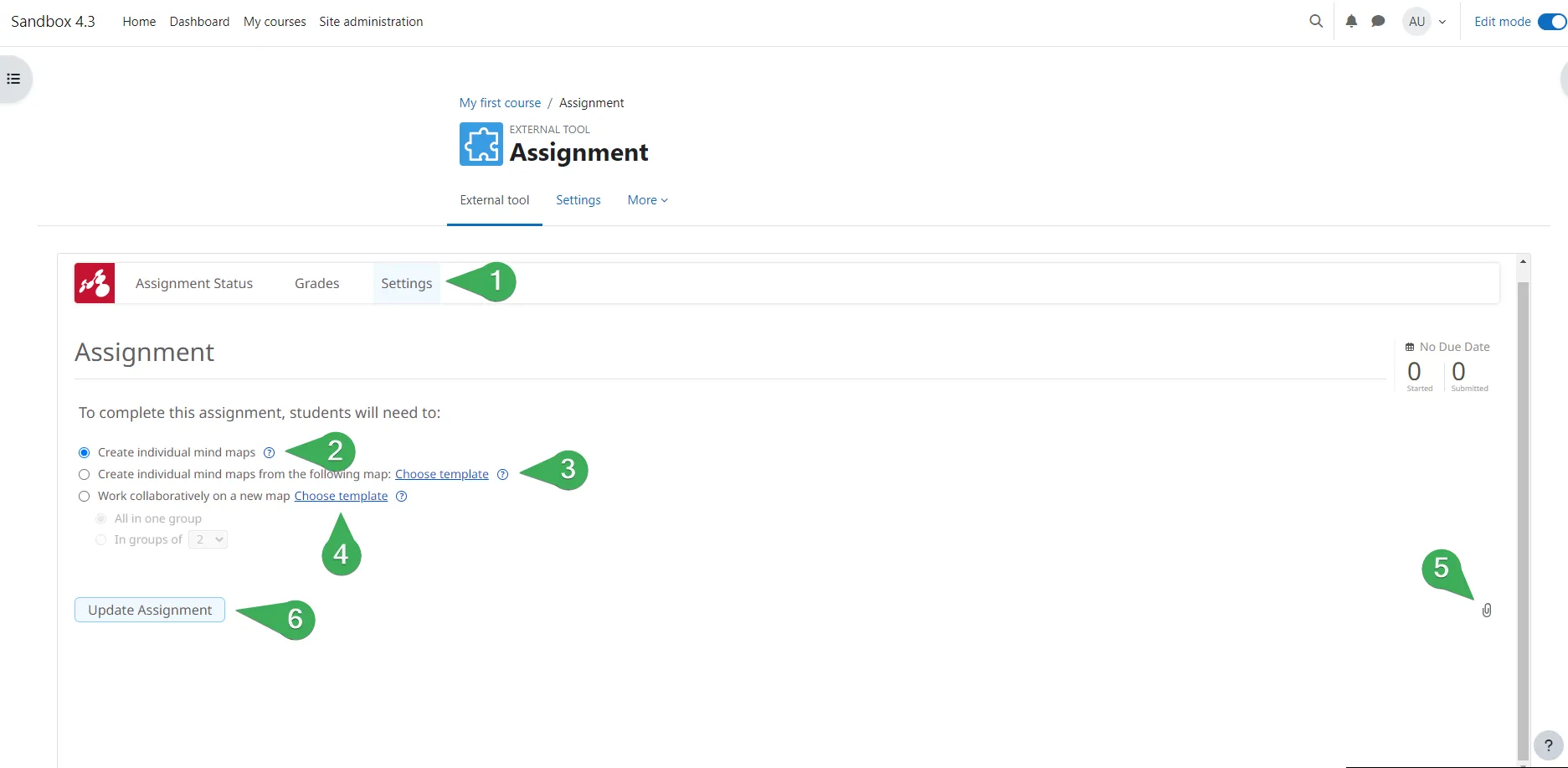 Los estudiantes pueden trabajar individualmente o en grupos para crear mapas mentales relacionados con los temas cubiertos en tus cursos de Moodle. Pueden trabajar en las tareas directamente desde Moodle sin crear cuentas o iniciar sesión por separado. Una vez que los estudiantes comienzan sus tareas, los profesores pueden acceder y calificar sus mapas directamente desde Moodle.