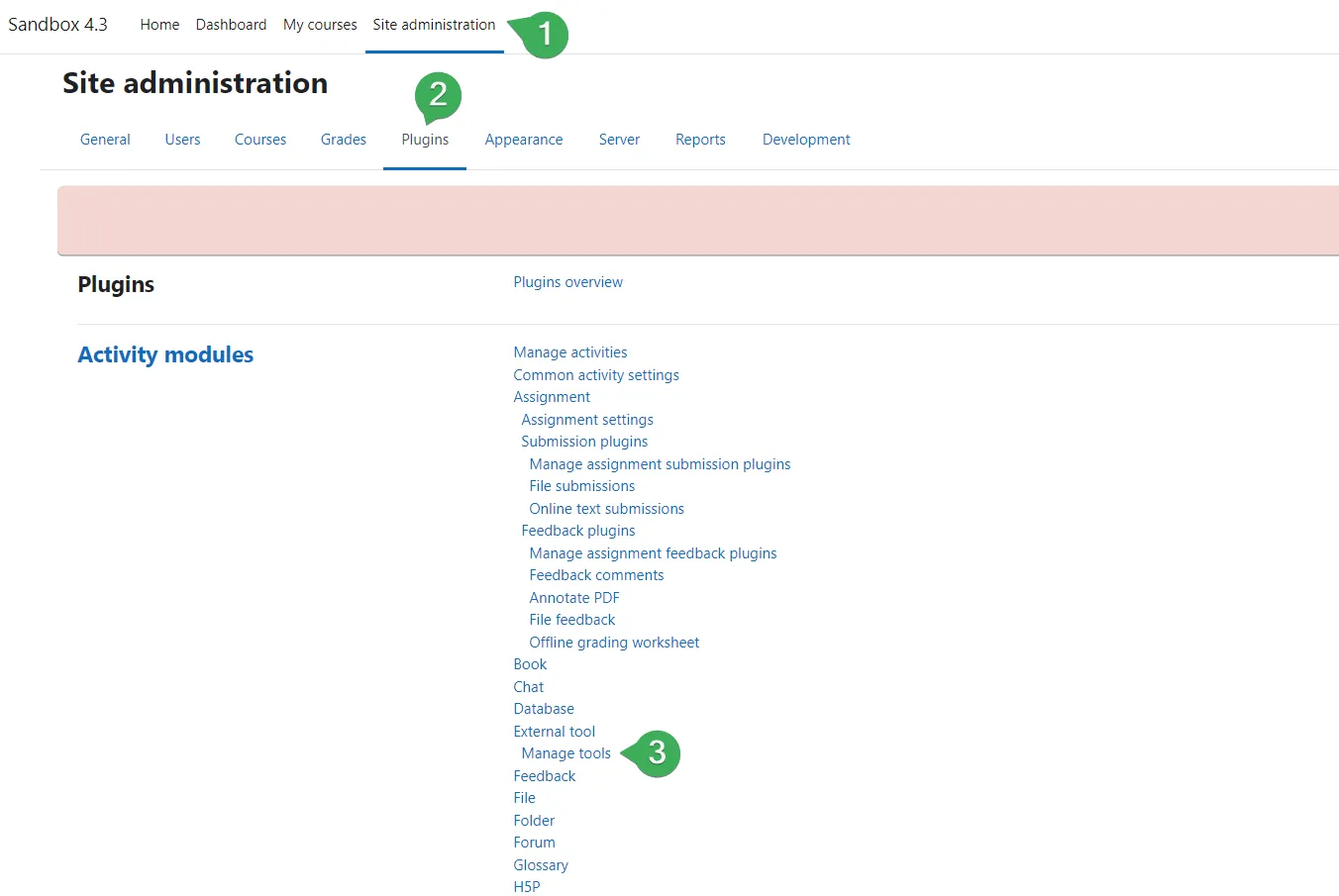 Sección titulada «Añadir Mindomo como una herramienta externa»Paso 1. El Administrador del Sitio de Moodle debe ir a Administración del sitio (1), luego a Plugins (2), y bajo Módulos de actividad, hacer clic en Gestionar herramientas (3).