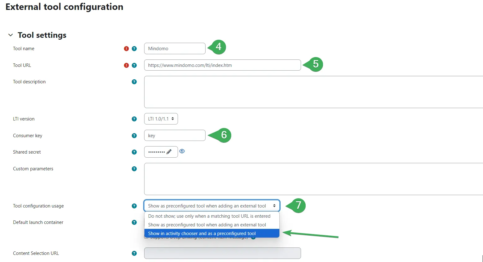 Paso 3. Escribir Mindomo en el campo Nombre de la herramienta (4), añadir la URL de la herramienta https://www.mindomo.com/lti/index (5), añadir la Clave del consumidor y el Secreto compartido proporcionados por Mindomo (6), y guardar los cambios.