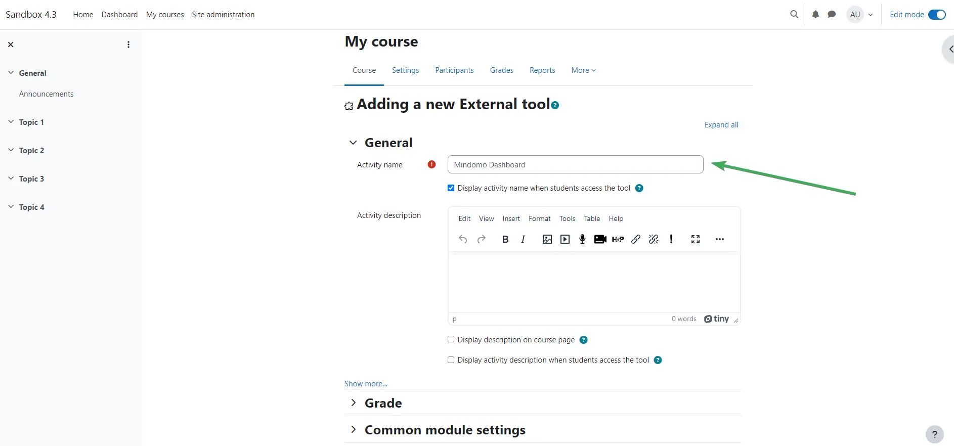 - Introduce un nombre (por ejemplo, Panel de Mindomo) en el campo Nombre de la actividad.