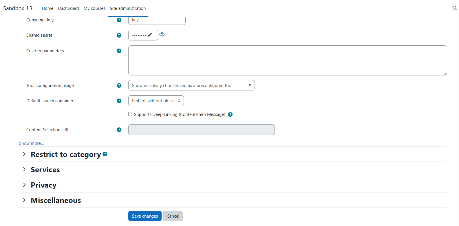 La Clave del consumidor y el Secreto compartido se pueden encontrar en la sección Administración de la escuela de tu cuenta, bajo Configuración: https://www.mindomo.com/school#settings.