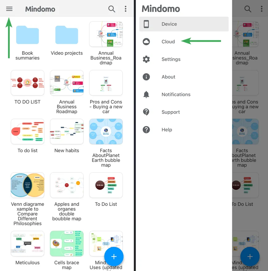 - Cloud: necesitas iniciar sesión en una cuenta de Mindomo Cloud, y los diagramas almacenados en esta sección se sincronizarán automáticamente con tu cuenta de Cloud (y podrás acceder a los diagramas desde cualquier dispositivo).