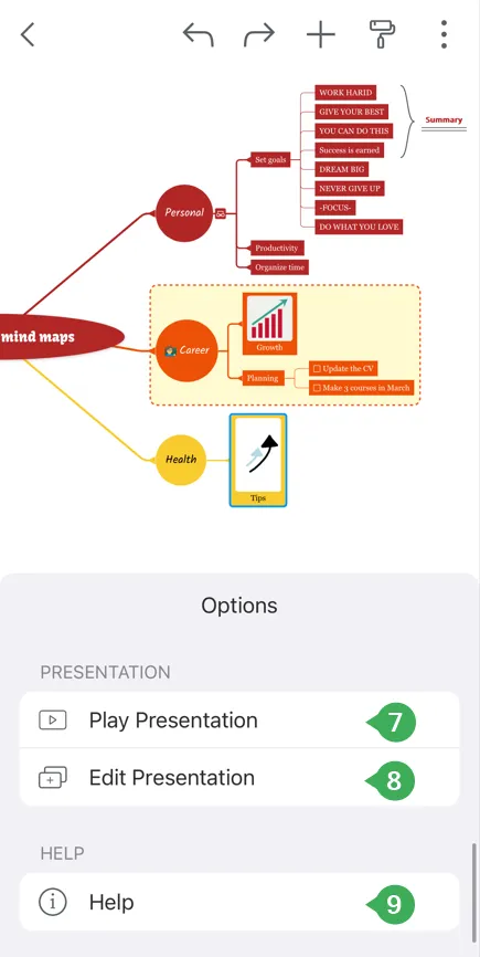 - Notas - añade o elimina notas a los temas de tu mapa mental
