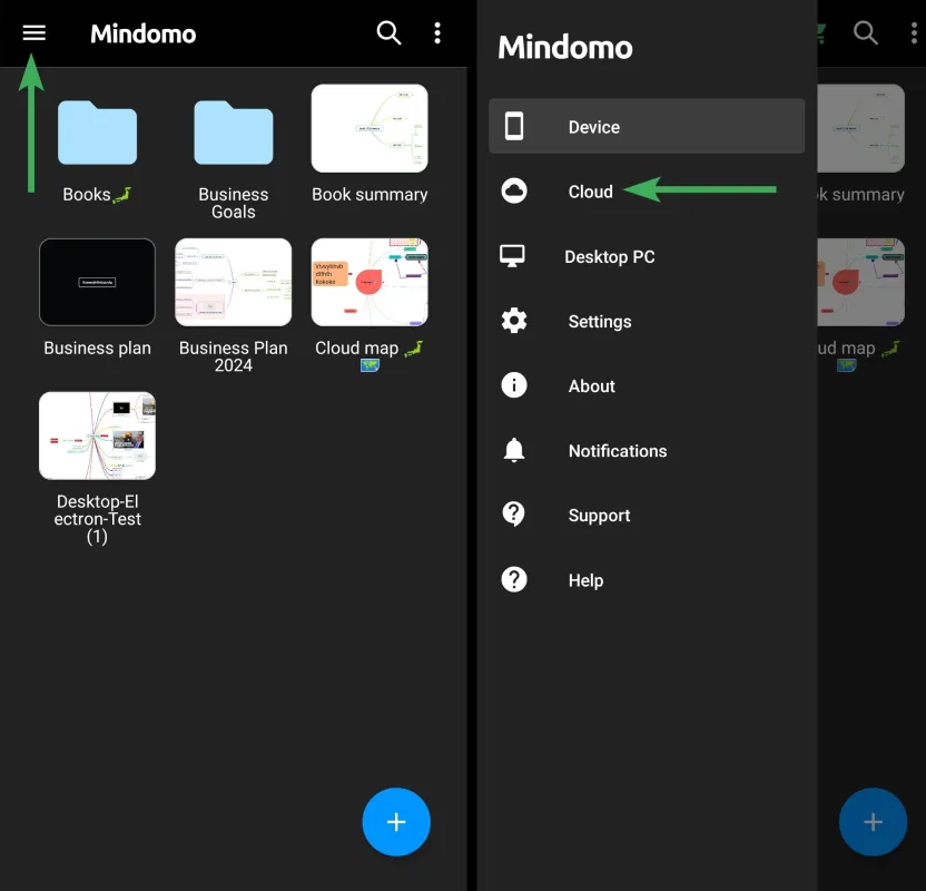 Abre la aplicación móvil de Mindomo y toca en el menú de archivos.