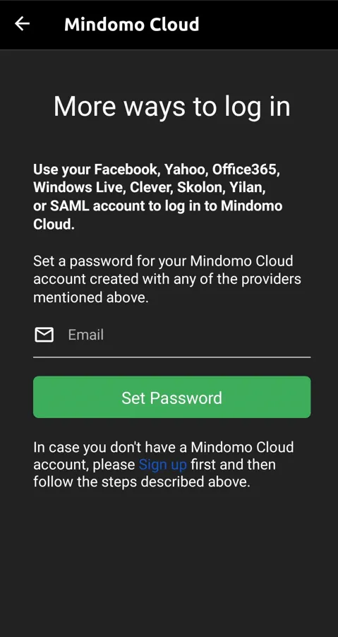 Si te registraste en Mindomo usando una cuenta de terceros, esta guía te mostrará cómo establecer una contraseña e iniciar sesión en la aplicación móvil directamente con tu correo electrónico.