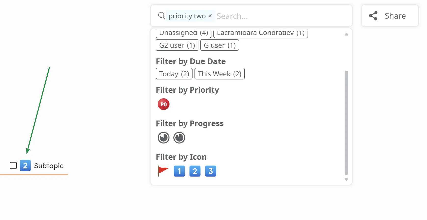 Sección titulada «Filtrar tareas por Iconos»También puedes filtrar tareas por iconos, que aparecen en la sección de Filtro debajo de Progreso. Los iconos que usaste en tu mapa aparecerán en la barra de Búsqueda, y puedes seleccionarlos desde allí.