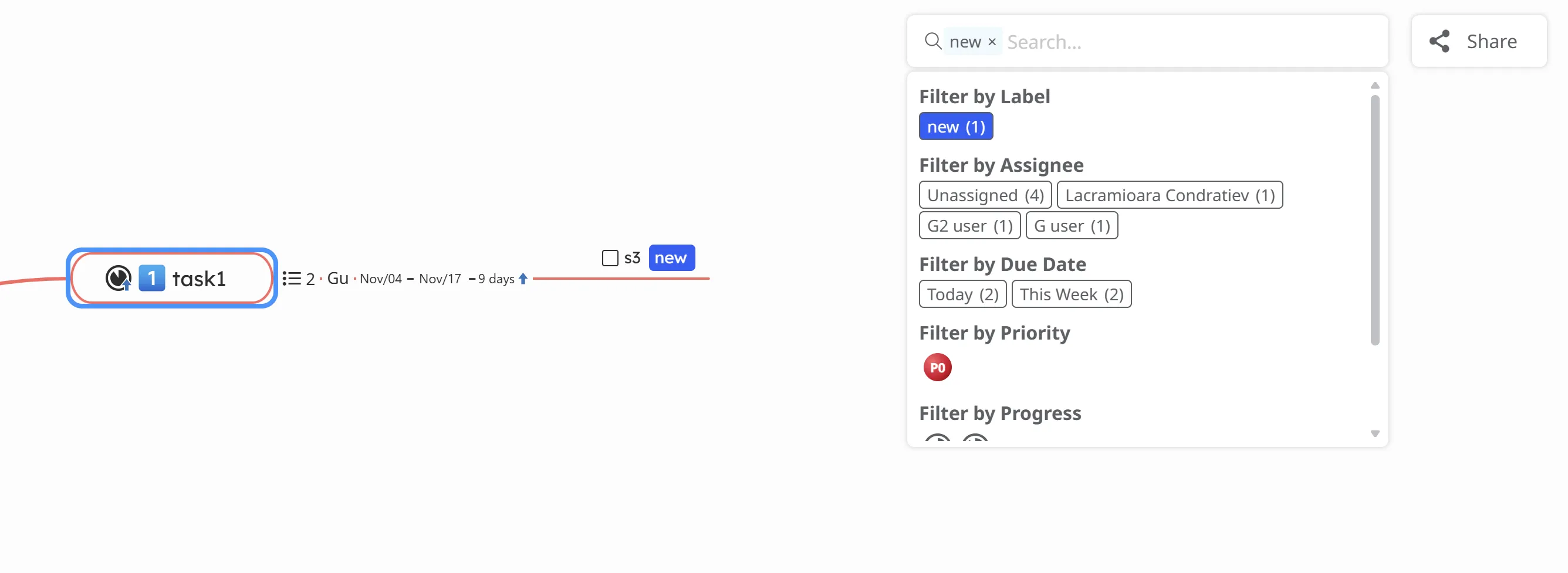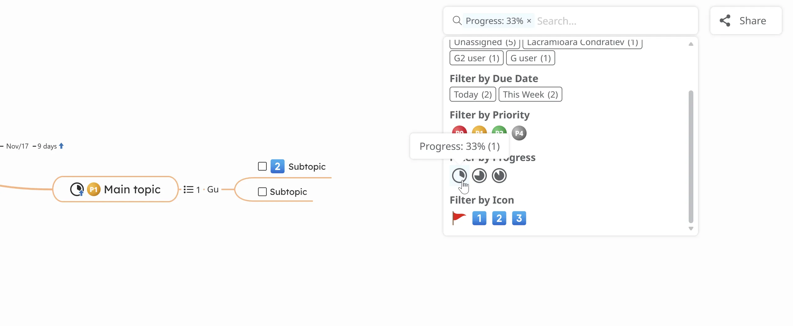 Sección titulada «Buscar y filtrar tareas en un mapa mental»En un mapa mental, puedes filtrar tareas por:
