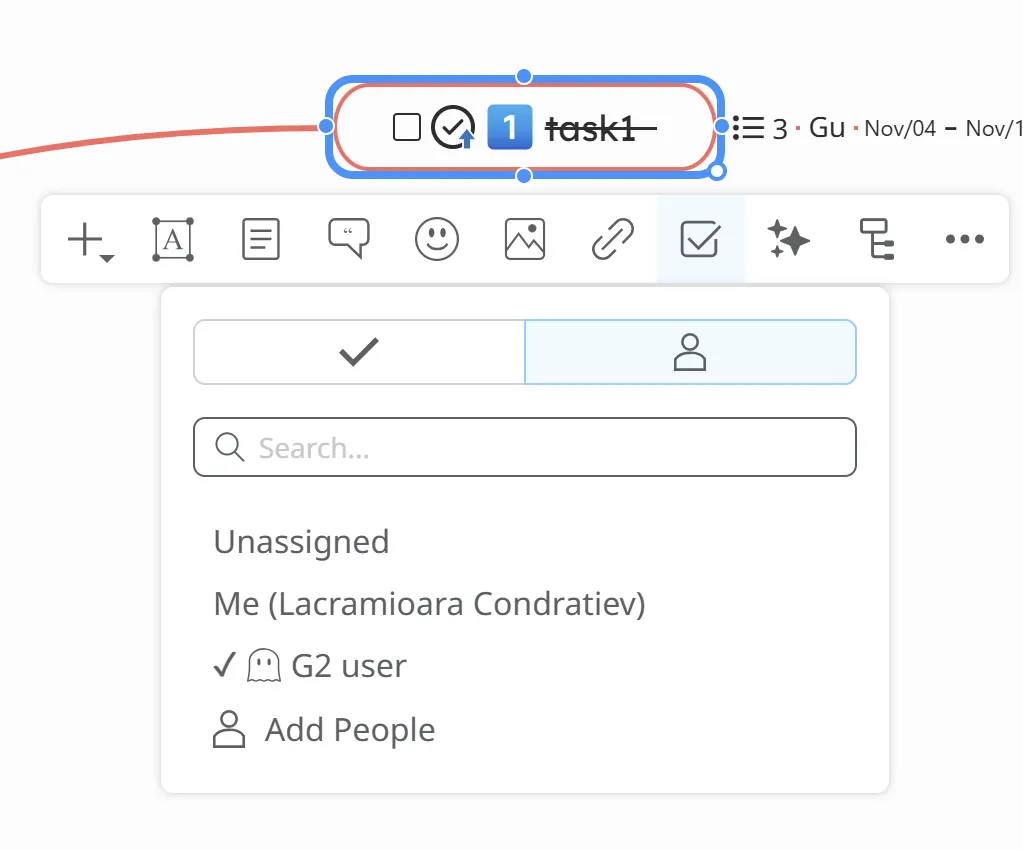 Sección titulada «Filtrar tareas por Asignado»Puedes asignar tareas a uno o más de tus colaboradores, y ellos pueden asignarte tareas de vuelta. Filtra tareas por su asignado, ya sea por los nombres de usuarios registrados de Mindomo o buscando los nombres de los usuarios fantasma que has creado.