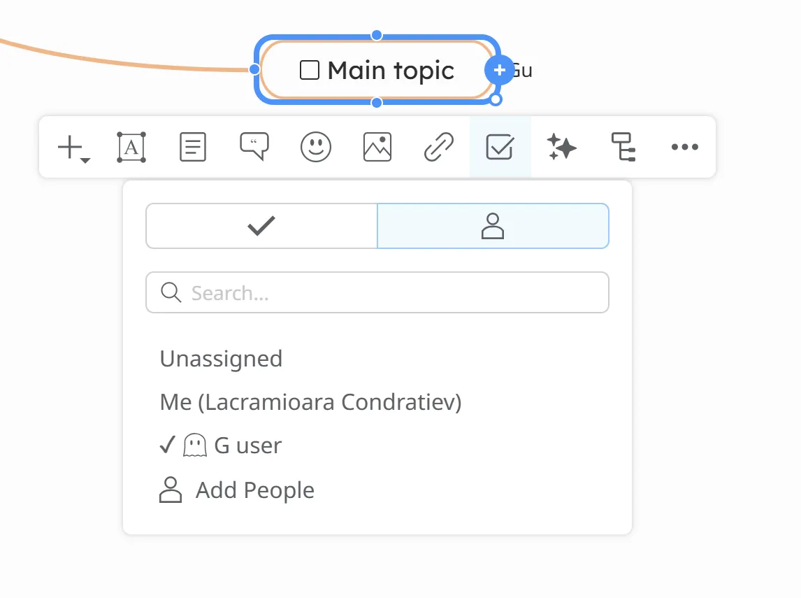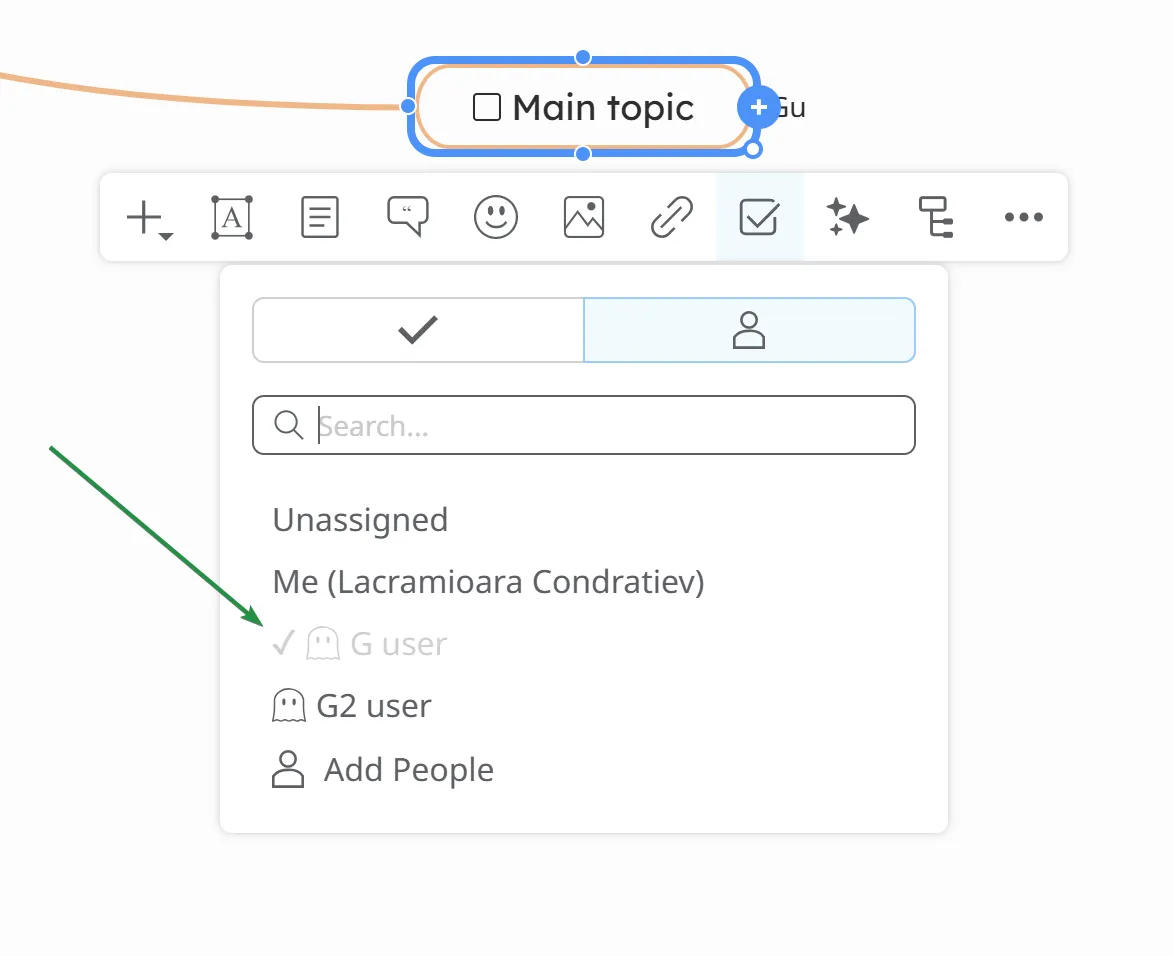 Sección titulada «Usar usuarios fantasma en otros mapas mentales»Todos los usuarios fantasma que crees estarán disponibles en otros mapas. Selecciónalos de la lista y asígnales nuevas tareas.