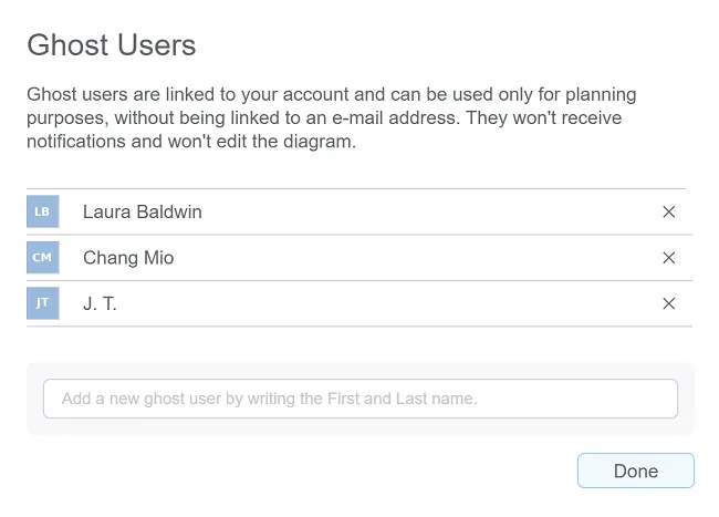 Sección titulada «Lista de usuarios fantasma»Puedes agregar más usuarios fantasma a la lista. Agrega un nombre y apellido o las iniciales de la persona. No puedes agregar el mismo nombre dos veces.