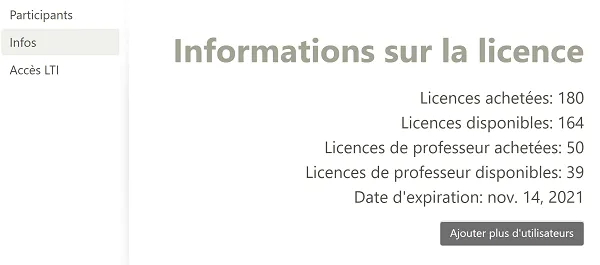 Section intitulée « Informations sur la licence »La section Infos de votre page Administrateur d’école vous offre un aperçu clair du nombre de comptes d’enseignants / étudiants disponibles pour votre licence, de la date d’expiration de la licence, etc.