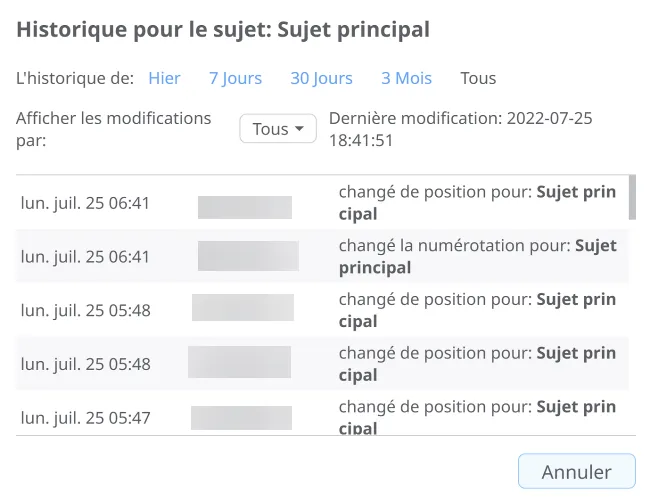 Section intitulée « Voir les changements pour le sujet »Si vous cliquez sur Outils, puis sur Afficher les modifications de la rubrique, vous verrez les modifications que vous ou vos collaborateurs avez apportées à cette rubrique. Vous pouvez également voir la date des changements. De plus, vous pouvez voir les changements effectués sur différentes périodes de type 1 jour, 7 jours, 30 jours ou 3 mois.