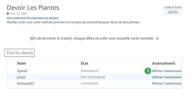 Section intitulée « Évaluation et feedback »Pour donner aux étudiants du feedback sur leur progrès, vous devez aller au “État du devoir” et cliquer sur “Afficher l’avancement”.