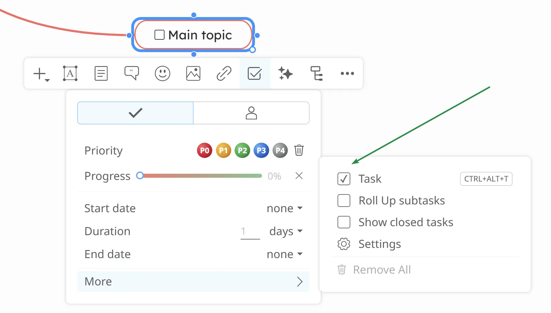 Select a topic or subtopic and click the Task button on its toolbar. Then choose More → Task. The topic will be converted into a task, which can be divided into smaller, assignable subtasks.
